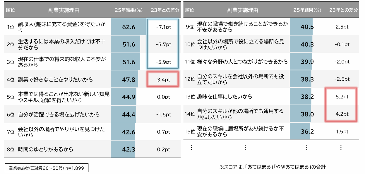 つまり、「副業=収入のため」 から「副業=キャリア形成・自己実現」 へと意識が変化していることがわかります。