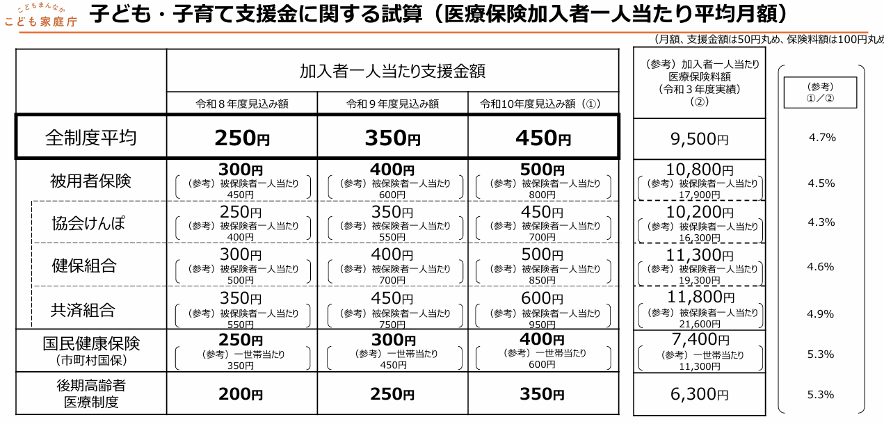 こども家庭庁の試算では、次のとおり平均的な負担額が示されています。(見込み)