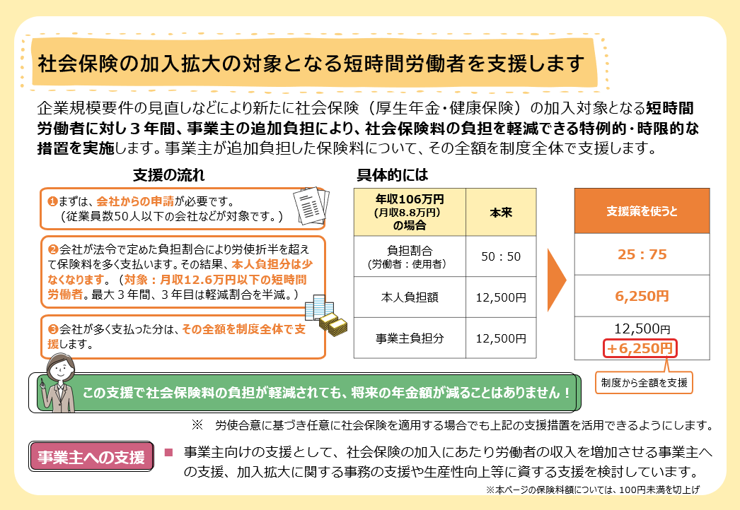 社会保険の加入拡大の対象となる短時間労働者を支援するため、特例的・時限的に保険料負担を軽減する保険料調整の措置が実施が検討されています。
