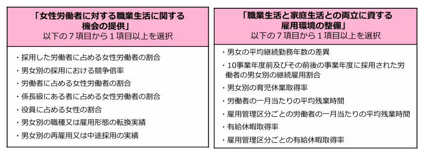 具体的には、次の表のとおりで「男女間賃金差異」に加え、「女性管理職比率」の項目が必須となりました。