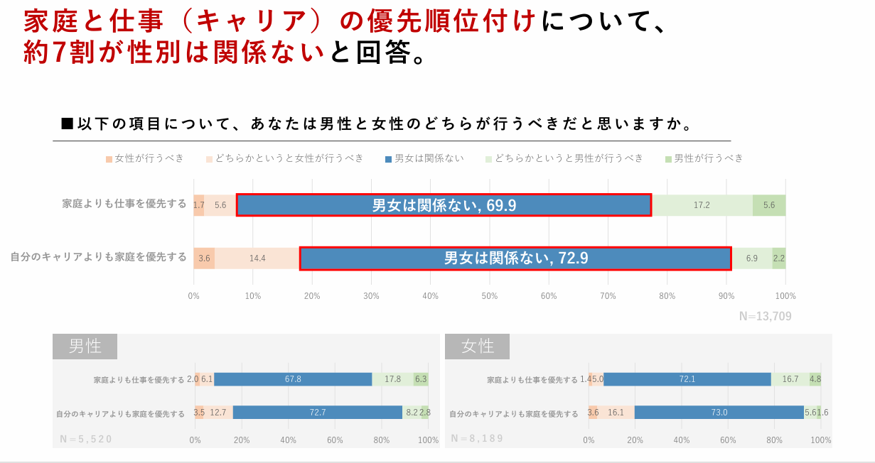 また、令和7(2025)年の厚生労働省の「若年層における仕事と育児の両立に関する意識調査」によれば、男女問わず若年層の多くが「共働き・共育児」を前提としたキャリアを求めているという結果がでています。