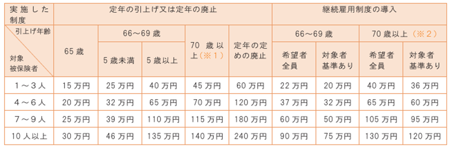 65歳へ定年を引き上げた場合の支給額は、昨年度から変更ありませんが、66歳以上への定年の引上げや継続雇用制度を導入した場合の支給額は増加しています。