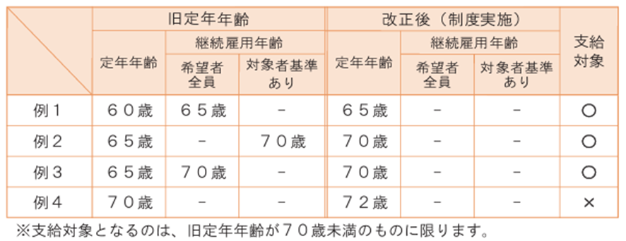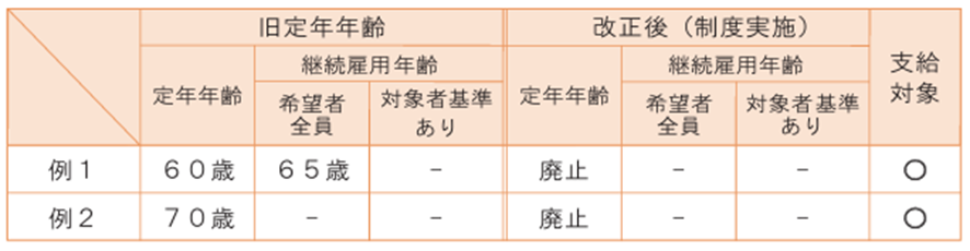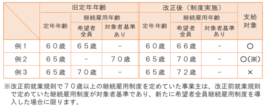 - 継続雇用制度の導入について、希望者全員を対象とする制度に加え、対象者基準に該当する者を対象とする制度を支給対象に追加